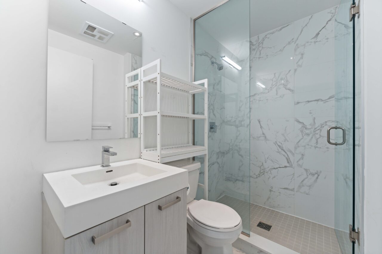 The sleek kitchen features stone countertops, stainless-steel appliances, a gas cooktop, and European-style cabinetry. This layout is perfect for those who appreciate both form and function. The spa-like bathroom offers modern fixtures and a clean, elegant design to complete the space.